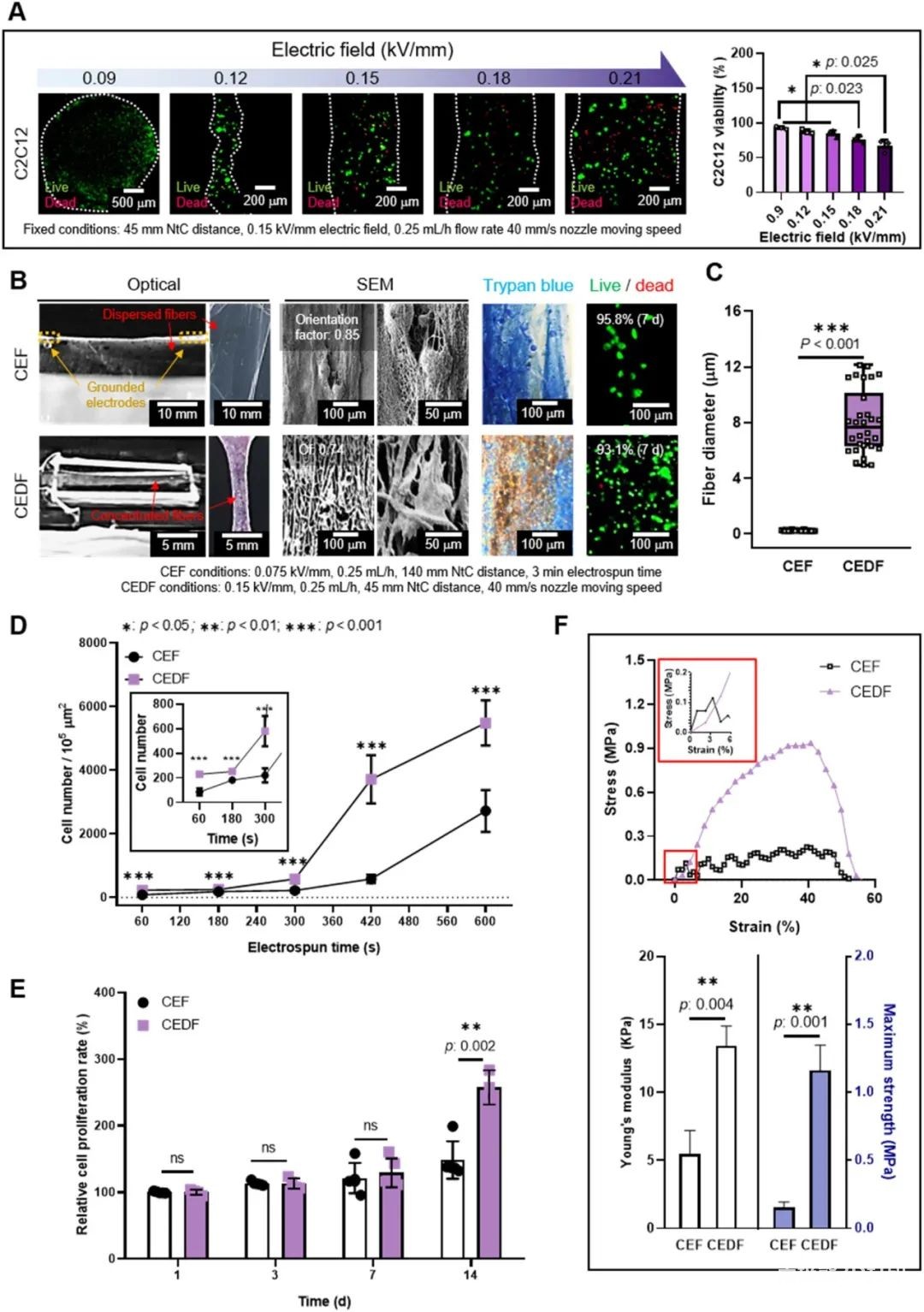 In order to compare the electro-direct write-carrying cell fiber and the traditional cell electrospinning, the researchers tested the cell viability of the bio-ink under different electric field strengths, as shown in Figure 4. According to the experimental results, the electric field of 0.15 kV/mm can keep the cell survival rate high, and the fiber formation is better, so this parameter is selected to prepare the uniaxially arranged cell-carrying microfiber structure. Compared with traditional cell electrospinning, electric direct writing can better deposit in designated parts and reduce loss, and due to dense fiber deposition, the number of cells in electric direct writing fibers is significantly higher than that of traditional cell electrospinning. In addition, in terms of cell viability and cell proliferation rate, electric direct writing fibers are better than cell electrospinning, and their mechanical properties are closer to natural muscle characteristics.