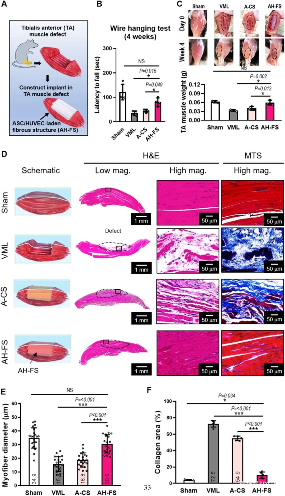 Finally, in order to evaluate the regenerative ability of muscle defects, as shown in Figure 8, the electrical direct writing cell-carrying fiber technology was used to construct muscle structure (AH-FS) with adipose stem cells (ASCs) and HUVECs.Use GelMA and3D printingThe process is used as a control to manufacture a conventional structure (A-CS) with ASC. After comparison, the AH-FS group significantly induced muscle regeneration. These in vivo results represent the potential of cell-loaded fiber structure to treat volumetric muscle loss (VML).