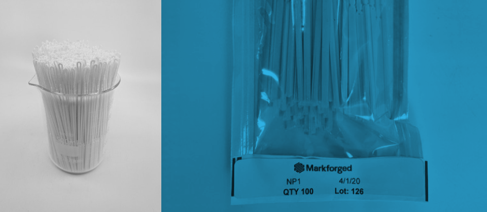 Markforged collaborated with Neurophotometrics to produce rayon-wrapped nasopharyngeal (NP) swabs for COVID-19 testing. These swabs are ready to be distributed and have several key advantages compared to alternative solutions:
