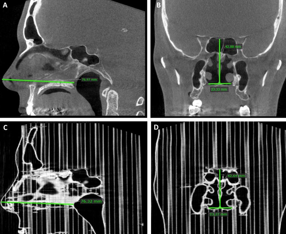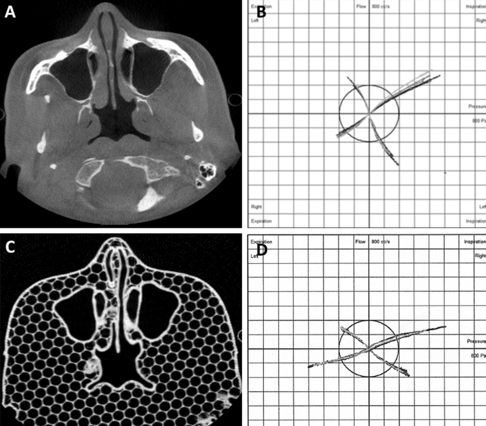 The patient’s CBCT scan and the corresponding PLA nasal pressure measurement model. The picture comes from the University of Tampere.