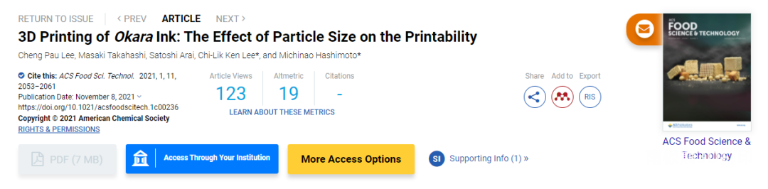 The research was completed by researchers from Singapore University of Technology and Design and Nanyang Technological University. The related research is “3D Printing of Okara Ink: The Effect of Particle Size on the Printability.” The topic was published in the international journal ACS Food Science & Technology, and was selected as the front cover of the current issue (Volume 1, Issue 11, 2021).