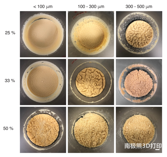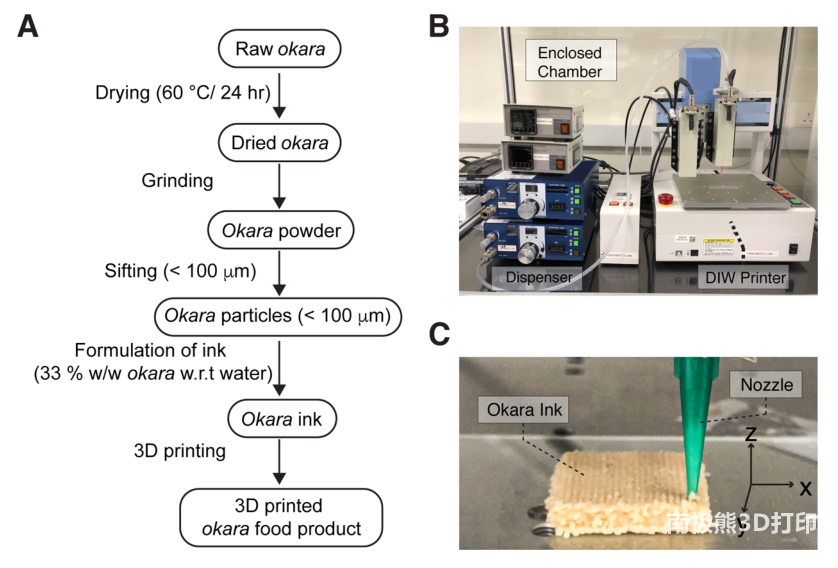 In order to realize the reuse of bean dregs, the researchers collected the bean dregs as kitchen waste from a local soymilk supplier, dried and pulverized the bean dregs, and then used 500μm, 300μm and 100μm sieves to sieve the bean dregs powder. In order to distinguish the particle size of the bean dregs. Without adding any food additives, only add water to configure Okara ink with different concentrations (25%, 33%, 50% w/w), and then perform direct ink writing (DIW) 3D printing.