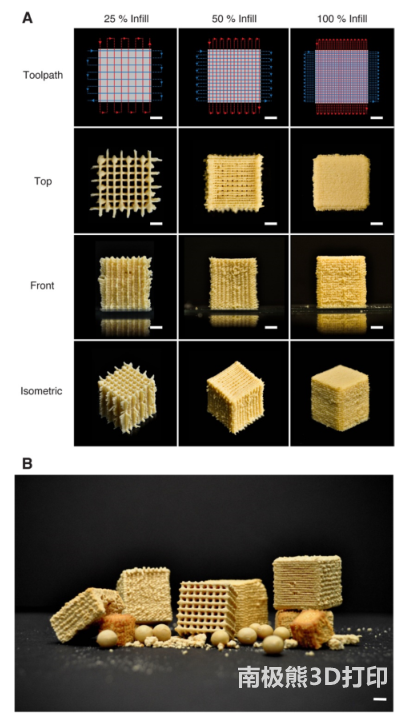 Research shows that particle size is an important variable that determines the rheological properties of Okara ink. When Okara powder particle size is less than 100μm and the concentration is 33%, its yield stress is 200±40Pa, storage modulus is 23300±300Pa, no particles The blocking phenomenon caused by agglomeration occurs, which can be used for 3D printing. The selected ink can maintain the printed structure without being deformed due to diffusion, and the researchers achieved 3D printed okara with different textures (such as hardness and adhesion) by adjusting the filling density of the 3D structure (Figure A below).