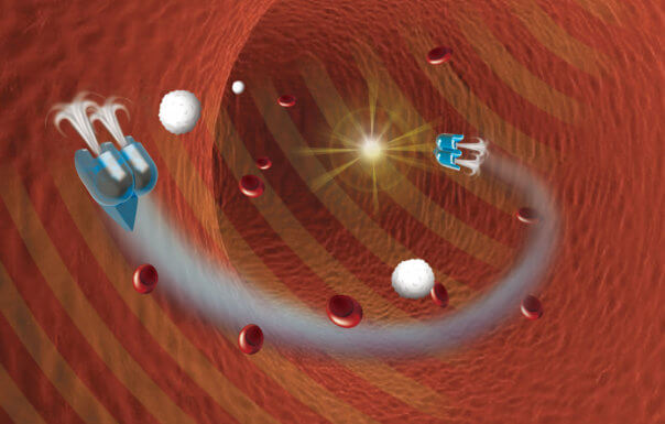 The researchers say the next challenge is to make the robots biocompatible so that they can navigate blood cells of similar size. They will also be made of biodegradable materials, allowing many robots to be dispatched at once. Just as fertilization requires a sperm cell, for a robot to perform its tasks, volume is the key.