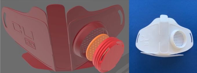 The Copper3D NanoHack mask model is shown on the left, which demonstrates the intermediate stage of mask completion.The masked3D printingModel, right