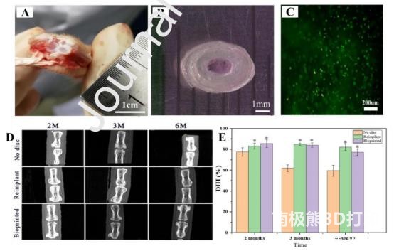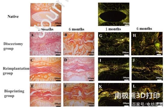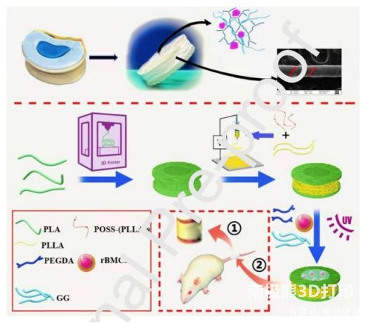 disease. Tissue engineering technology provides a promising method for repairing and regenerating the physiological function of damaged IVD. A successful tissue-engineered IVD scaffold should mimic the histology and macrostructure of the native IVD.Here, the researchers combine3D printingAnd electrospinning to construct an artificial IVD composite scaffold. Polylactide (PLA) is used to print IVD frame structure, directional porous poly(l-lactide)/eight-arm polyhedral oligomeric silsesquioxane (PLLA/POSS-(PLLA) 8) fiber bundle simulation fiber ring ( AF), gellan gum/poly(ethylene glycol) diacrylate (GG/PEGDA) double network hydrogel loaded with bone marrow mesenchymal stem cells (BMSCs) simulates the structure of the nucleus pulposus (NP). Morphological and mechanical performance tests show that the structure and mechanical properties of IVD stents are similar to those of natural IVD stents. The compressive modulus of the scaffold is about 10MPa, which is comparable to natural IVD, and provides good mechanical support for tissue repair and regeneration. At the same time, the porosity and mechanical properties of the scaffold can be adjusted through the 3D model design. In the AF structure, the fiber bundles are oriented concentrically, and each subsequent layer is at 60° to the spine, which can withstand the tension generated during the deformation of the NP. In the NP structure, BMSCs are evenly distributed in the hydrogel and can maintain high cell viability. Animal experiment results show that the bionic artificial IVD scaffold can maintain the intervertebral disc space and generate new extracellular matrix.This engineered bionic IVD stent is a very promising