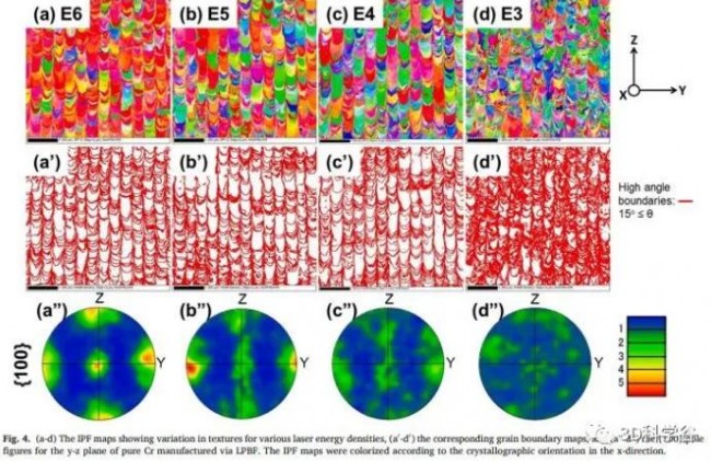 (Ad) IPF diagrams of texture changes caused by different laser energy densities; (a’-d’) corresponding grain boundary diagrams; (a”-d”) yz plane {100} pole diagrams of pure Cr produced by LPBF.