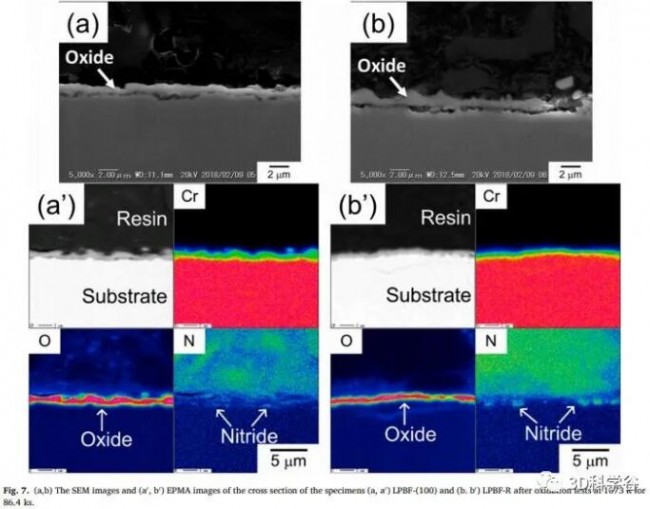 (A,a’) SEM image and EPMA image of the cross section of LPBF-(100) after oxidation; (b,b’) SEM image and EPMA image of the cross section of LPBF-R after oxidation