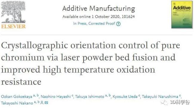 Researchers from Osaka University in Japan used LPBF processing technology to manufacture pure Cr for the first time, and controlled the crystal texture of pure Cr to study its high-temperature oxidation behavior. Related papers were published in Additive Manufacturing, an authoritative journal in the field of additive manufacturing, with the title “Crystallographic orientation control of pure chromium via laser powder bed fusion and improved high temperature oxidation resistance”.