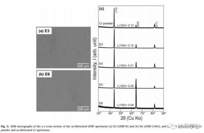 The relative density of pure Cr samples manufactured by Osaka University in Japan exceeds 90%, and the relative density increases with the increase of energy density, and the highest relative density is 95.47%. The manufactured sample is composed of pure chromium with a body-centered cubic (BCC) structure without any other phases. The relative strength of (200) texture increases with the increase of energy density. Under the manufacturing conditions with higher energy density, a strong crystallographic texture with (100) orientation along the structural direction (LPBF-(100) for short) is formed, and random orientation is formed when manufacturing at lower energy density The crystallographic texture (LPBF-R for short) indicates that the crystal texture of the Cr sample can be controlled by controlling the laser energy.