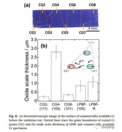 The study found that compared with randomly oriented Cr samples, the oxide layer thickness of (100) oriented Cr samples is smaller. This is due to two factors: (1) the orientation dependence of the oxidation resistance in the grain is suppressed in the (100) crystal orientation; (2) the intergranularity caused by the special grain boundary of oxidation resistance (CSL grain boundary) Delayed oxidation. The oxide layer thickness curve conforms to the parabolic rate law. Compared with randomly oriented Cr, (100) oriented Cr has a lower parabolic rate constant. This indicates that (100)-oriented Cr is more resistant to oxidation.