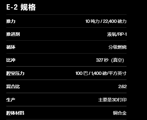 The E-2 engine is designed as a closed-cycle segmented combustion engine, using a single engine to power the first stage, enabling a small, low-cost rocket to carry a relatively large amount of payload.