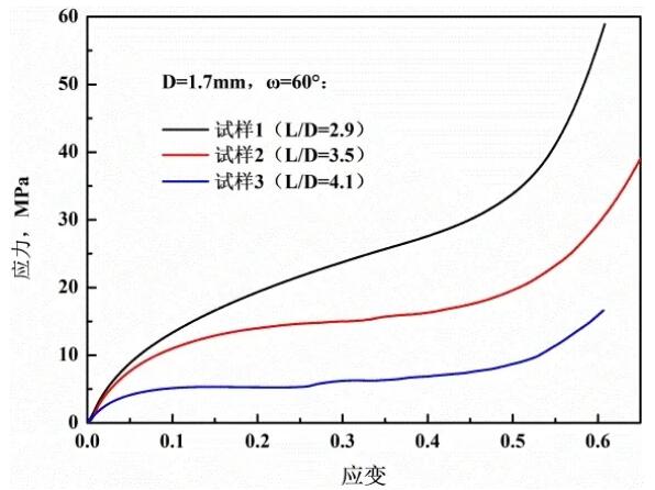 Figure 3 The influence of the aspect ratio on the compressive stress-strain curve of the specimen when the included angle is 60°
