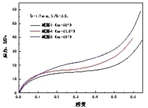 Figure 4 The influence of the included angle on the compressive stress-strain curve of the specimen when the aspect ratio is 3.5