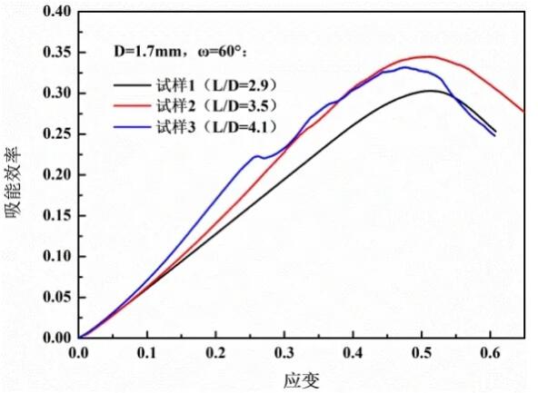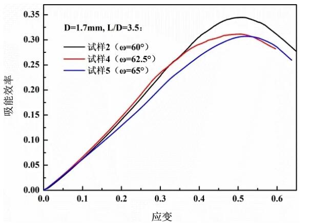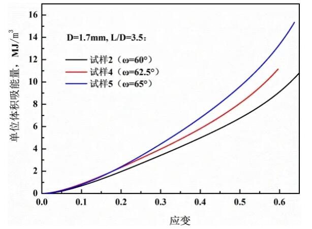 It can be seen from Figure 7 that when the strain is less than 0.3, as the aspect ratio increases, the energy absorption efficiency gradually increases, but when the strain is greater than 0.45, the energy absorption efficiency is the highest when the aspect ratio is 3.5. At the same time, it is also found that the length When the diameter ratio is 2.9 and 3.5, the strain at the densification point is both 0.51, and when the aspect ratio is 4.1, the strain at the densification point is 0.48. It shows that the included angle remains unchanged, and the length of the stress platform is not directly proportional to the ratio of length to diameter. The difference is that when the aspect ratio is constant, with the increase of the included angle, the strain value of the densification point does not change much, all around 0.51, as shown in Fig. 8. The energy absorption per unit volume at the compact point is shown in Figure 9. It can be seen that by appropriately increasing the angle or reducing the aspect ratio, the energy absorption per unit volume at the compact point can be increased.