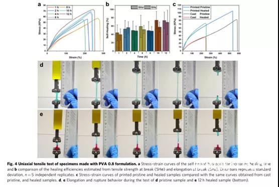 Tensile tests were carried out at different SH times, and quantitative time evaluation of the SH process was carried out (Figure 4a). As you can see, the system has recovered a lot in the first two hours. After that, the amount of recovery increased slightly with time, reaching an achievable recovery level after 12 hours of exposure (Figure 4b). As time increases, it may be the result of PVA inter-diffusion. The possibility of diffusion beyond the interface plane was qualitatively evaluated using two water-soluble dyes on different sides. After recombination, purple is observed at the interface. (Figure 3c), this is the result of mixing red and green dyes. Note that these two dyes have different diffusivities in the hydrogel, so purple seems to only appear on one side of the interface. The variability of the stress-strain curve shown in Figure 4b may be attributed to the irregular rupture of the healing specimen, which failed to extend at the interface as expected (Figure 4d). The original sample suddenly separated after reaching the ultimate tensile strength. The healed specimen did not split immediately, but gradually fell off along the cut area. This feature provides an additional safety mechanism for repairing samples, because it avoids the sudden detachment of the repair interface that is not too strong.