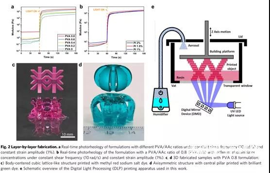 It should also be pointed out that the main challenge of DLP high-precision printing is to avoid the evaporation of water during the exothermic polymerization reaction. This leads to thickening of the printable ink, which leads to a gradual increase in the PVA concentration at the interface, and interferes with the layer separation/stacking step, resulting in a decrease in printing accuracy. We set up a humidifier above the trough to overcome this difficulty.