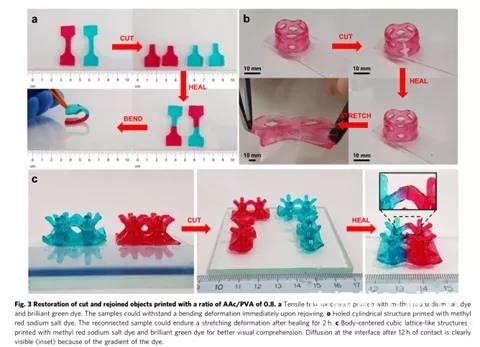There is a high potential for medical applications. So far, this kind of hydrogel can only be processed by extrusion additive manufacturing technology, which has many limitations in terms of structural design and printing accuracy. Here, the research group of Ignazio Roppolo of Politecnico di Torino in Italy proposed to use a commercial DLP printer to light-curing and print a hydrogel with self-healing ability. These hydrogels are based on semi-interpenetrating polymer networks that can self-repair printed objects. Auto-recovery happens quickly at room temperature and does not require any external triggers. After the specimen re-healed, it was able to withstand the deformation and recovered 72% of the initial strength after 12 hours.The method proposed in this paper enables self-healing hydrogel objects with complex structures to3D printingBecomes possible for the transition from soft robots to