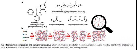 By adding the precursor of the chemical covalent network to the solution containing the linear polymer, a semi-interpenetrating hydrogel network is obtained. Combine non-photocrosslinkable polyvinyl alcohol (PVA) aqueous solution with acrylic acid (AAc), crosslinking agent poly(ethylene glycol) diacrylate (PEGDA) and diphenyl (2,4,6-trimethylbenzyl) Acyl) phosphine oxide (TPO) water-compatible photoinitiator was mixed to obtain a photocurable ink (Figure 1.a). Add organic water-soluble dye lemon yellow to improve printing resolution. PVA has inter-chain diffusion characteristics and the presence of hydroxyl groups that form hydrogen bonds, which makes PVA an attractive self-healing material. In preliminary experiments, the optimal molecular weight (MW) of PVA was determined to be 89-98 kd for our application. Low-molecular-weight PVA does not show sufficient self-healing properties, and high-molecular-weight PVSA provides suitable viscosity for DLP. Similarly, higher molecular weight PVA is also unacceptable, because the viscosity of PVA is also very high at low concentrations. AAc and PEGDA have been widely used in light-curable printing to make high-resolution objects because they can perform rapid light-induced free radical photopolymerization in large amounts of water. In addition, the carboxyl group of acrylic acid can form multiple hydrogen bonds with the PVA chain, thus contributing to the self-repair ability. In addition, large amounts of water hinder the use of many commercial photoinitiators because most photoinitiators used in photocurable printing have low water solubility. Therefore, the application of water-compatible photo-initiated nanoparticles developed in this paper is essential for realizing rapid printing in commercial printers.