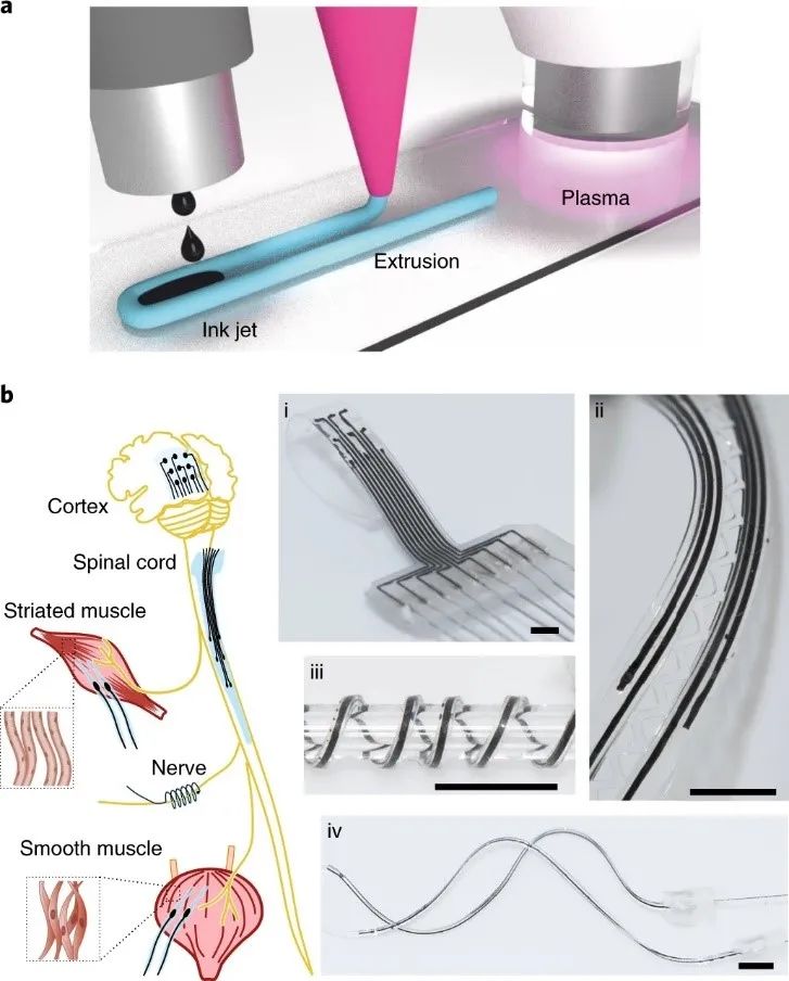 Researchers use flexible and biocompatible materials for multi-material printing to fabricate electrode arrays. Materials of different properties are processed by extrusion, inkjet and plasma surface activation, and the iterable design of the number and configuration of electrodes ensures the customizability of the electrode array.The insulating matrix is extruded from silica gel with a shear-thinning effect, which controls the overall geometry, tissue contact position and interconnection path of the electrode array. After the substrate is processed, electrical conduits can be deposited by inkjet printing.