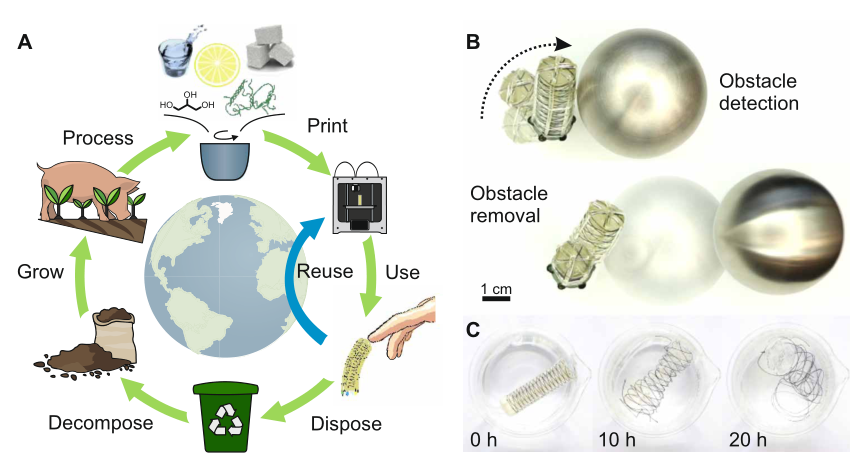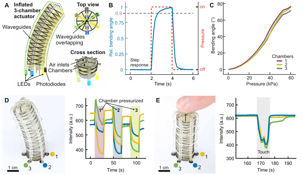 The researchers propose a 3D printed omnidirectional soft actuator made of sustainable biomaterials that enables multidirectional sensing through 3D printed soft optical waveguides. Versatile and high-precision sensors are able to sense the bending state of the actuator and its surrounding objects. This allows the soft robot to autonomously locate obstacles in its vicinity and remove them.