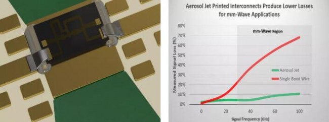 The millimeter wave frequency band includes 30 to 300 GHz, and the transmission signal power of each circuit connection in the millimeter range has increased by 100%. This means that the point-to-point range of wireless data transmission is longer, energy consumption is lower, and because low-power ICs can operate at lower temperatures, the IC has a longer lifespan. The Aerosol Jet® printing IC connection method is more efficient, and its performance is almost comparable to the thick copper circuit board etching method.