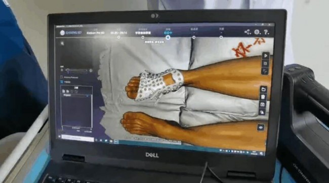 During the operation, Professor Ding Huanwen’s team will disinfect the3D printingThe positioning guide is worn on the back of the patient’s right foot again, and then the EinScan Pro 2X Plus is used as a multifunctional handheld3D scanninginstrumentScan the patient’s calf and foot. Understand whether there is any deviation in the positioning of the surgical guide, guide the adjustment of the position, so that the surgical guide is placed accurately, and then guide the precise placement of the nail and the talon navicular joint incision and fusion. The operation was successfully completed with the aid of new technology.