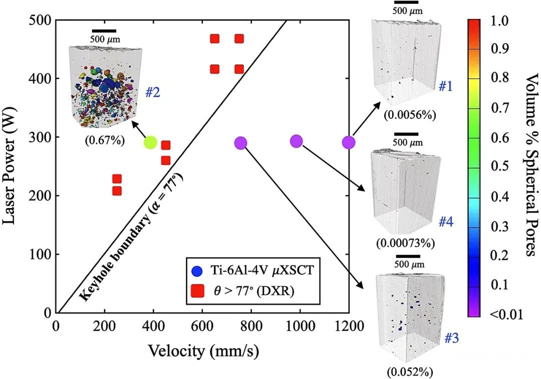 In order to analyze the keyhole severity leading to the keyhole porosity of the Ti-6Al-4V test block, in this study, the molten pool depth and morphological data of the medium Ti-6Al-4V DXR single-track experiment were plotted according to the Ti-6Al-4V test block . Figure 4 shows the Ti-6Al-4 V block printed in the high-power, low-speed region of the PV space according to the DXR Ti-6Al-4V molten pool morphology, θ>77°in. It can be easily observed that the sample 2 of the Ti-6Al-4V coupon is in the small-pore porosity range (θ>77°). This results in large-scale pinhole defects with spherical (pinhole) porosity values of approximately 0.67%. However, samples 1 and 4 have θ<77° and minimum spherical porosity, and sample 3 has a minimum porosity of about 0.00073% (Fig. 4). Compared to sample 2, this value is negligible, which is consistent with the large-scale small-pore porosity that occurs when θ > 77°. However, even though the front wall angle θ of Sample 3 was < 77°, it also contained spherical pinhole porosity (0.052%). This suggests that this approach may need to be revisited. More research suggests, but the current work confirms the DXR trend described in .