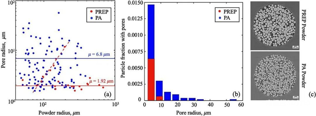 Figure 5 compares pore size and closed particle size in PA and PREP powders using ML segmentation and analysis techniques. Section 2.3 above describes the segmentation procedure used in this analysis. Note that the lower limit of size is determined by the resolution of the CT reconstruction; here a minimum pore volume of nine voxels was used, where a voxel size of 0.65 μm3 corresponds to a minimum pore size of 0.87 μm. Figure 6a shows the log-scale correlation plot, This graph relates the powder particle size (radius) to the particle size distribution of the pores contained within the pore particles of each Ti-6Al-4 V. powder sample. A logarithmic scale plot is used in Figure 6a to enhance the visualization of clustering behavior. Figure 6b shows the same pore size (radius) data as in Figure 6a, but shown in a histogram with a bin size of approximately 4 μm; the number and frequency of porosity for each powder is expressed as the fraction of particles with pores. NOTE: The two powders in Figure 5b were compared using the “fraction of particles with holes” because more PA powder particles (~5000) were measured than prepared particles (~3100). This is because of the average particle size of PREP The diameter is larger than the average particle size of PA, resulting in more PA particles per CT volume.