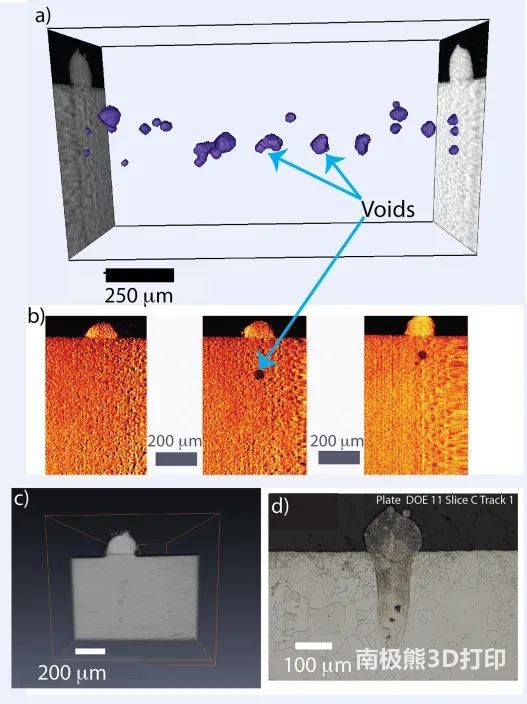 The upper figure shows the results of the SRμT investigation of the sample on the orbit with parameters of 137 W laser power, 188 mm/s scan speed and D4σ = 52 μm. Since pinhole mode laser melting was observed in metallographic studies, this sample was selected for tomography, as shown in Figure d. Figure a is the 3D distribution of the purple holes, and Figure b is the 2D tomogram of three sections at different positions in the sample along the laser trajectory. Each section in Figure b has a different distribution of holes. Panel c is a 3D rendering of the sample surface. Incomplete collapse of the vapor cavity leaves a void in the wake of the laser beam, as shown in Fig. X-ray tomography has previously been used to characterize 3D porosity in stainless steel welds (Madison and Aagesen, 2012). The 3D morphology of voids was observed for the anisotropy of the samples, and it was also found that the main contribution of total porosity in the samples was due to some of the voids with the largest void volume.