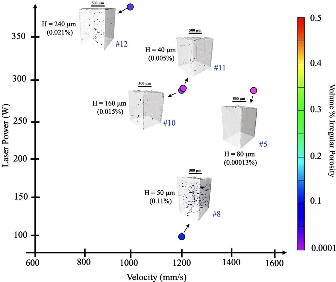 NOTE: Vd is the component of the laser velocity acting perpendicular to the surface, i.e. the velocity that causes the laser beam to penetrate the material. Therefore, as the laser speed increases, the pinhole front wall angle decreases, and thus the pinhole porosity decreases for a constant Vd. ROP was calculated from the time-resolved vapor deposition penetration depth in a fixed in-situ DXR experiment using the same PV combination as the test block fabrication. Figure 4 shows this, there is a significant difference in defect density between samples 3 and 4. Sample 3 showed clearly small, round defects, while samples 4 (P = 280 W) and 6 W (P = 370 W) showed acceptable results due to the 200 mm/s increase in laser speed in both cases. Negligible porosity. Although the defects observed in sample 3 were inferred to be small pore porosity, it is also possible that these μSXCT scan volumes contained some spherical pores in the powder. Therefore, it is necessary to further analyze and characterize the differences between gas and pinhole porosity on these samples.