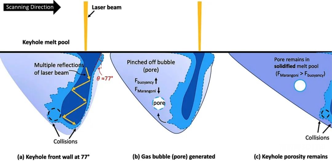 The elongation of the melt pool in the depth direction is indeed a key determinant of the small hole melt pool. As mentioned earlier, some degree of keyhole is necessary to create keyhole wall fluctuations that squeeze air bubbles (holes) into the molten pool. Figure 3 shows a schematic diagram of the transfer of pinhole porosity to the molten pool through front wall fluctuations. It is worth noting that in laser welding, the pinhole wall fluctuations that cause pores are related to the pinhole front wall angle (θ). Cunningham et al. found that when the value of θ is greater than 77°, large-scale small pores V are formed in LPBF Ti-6Al-4.