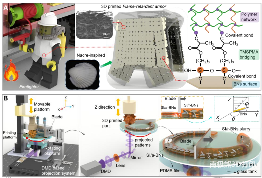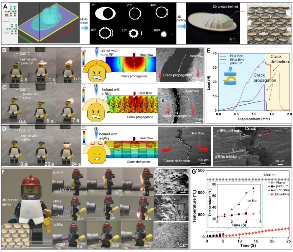 3D printingThe load-displacement curve of the helmet under compression; (F) the flame retardancy test of the 3D printed armor and SEM images of the armor of pure SI, r-BN and a-BN after burning; (G) between the printed armor and the LEGO firefighter body Temperature variation of the thermocouples for 3D printed armor backs with pure SI, SI/r-BN and SI/a-BN.