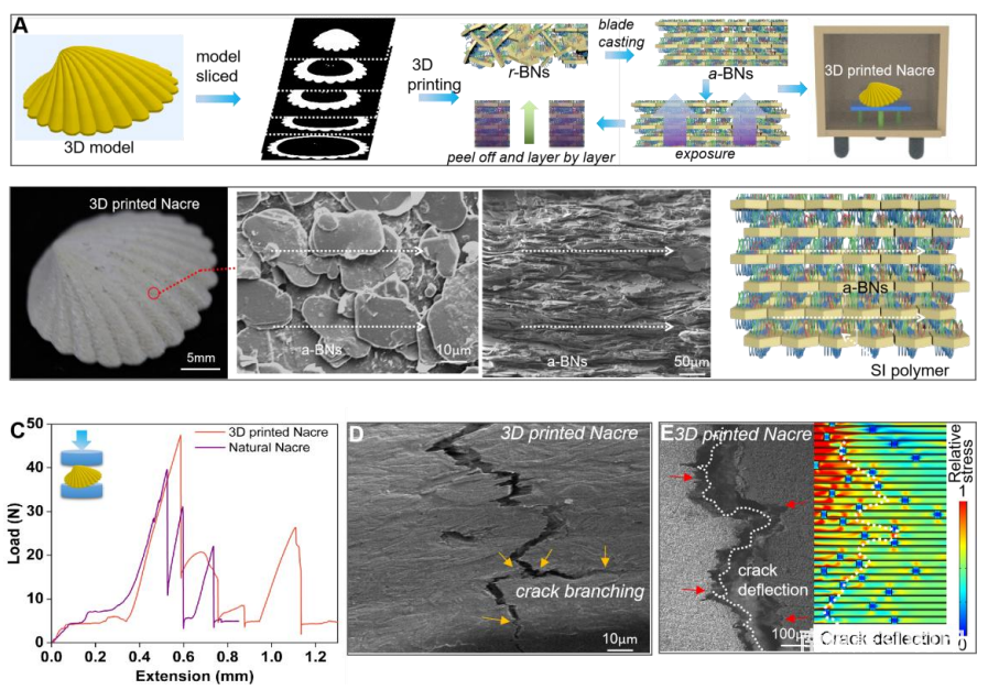2. The orientation mechanism of boron nitride (BN) in high viscosity slurry was studied. The nacre-inspired 3D printed structure with high loading of a-BN (55 wt%) showed higher fracture toughness and specific strength than natural nacre. Fundamental mechanistic studies revealed that the excellent mechanical properties were attributed to crack deflection, bridging of a-BNs, and covalent bonding between TMSPMA and the polymer matrix enhanced by large shear forces during boron nitride pull-out. Compared with pure photocurable resin, the structure enhances anisotropic thermal conductivity by a factor of 5.8.
