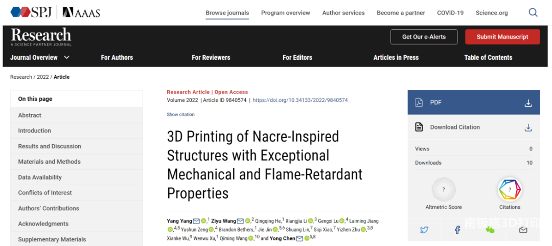 In view of this, the team of Assistant Professor Yang Yang of San Diego State University, the team of Professor Yong Chen of the University of Southern California, and the team of Professor Ziyu Wang of Wuhan University have cooperated to develop a nacre-inspired 3D printing structure, which has excellent mechanical and Flame retardant properties. Related research was published in an article entitled “3D Printing of Nacre inspired Structures with Exceptional Mechanical and Flame-retardant Properties” in the journal Research (a Science Partner Journal). The participants were Assistant Professor Xiangjia Li of Arizona State University, Assistant Professor Wenwu Xu of San Diego State University, Assistant Professor Qiming Wang of University of Southern California, PhD student Qingqing He of San Diego State University, PhD student Yushun Zeng, Gengxi Lu of USC, and postdoctoral fellow Laiming Jiang, Master students Siqi Xiao, Shuang Lin, etc.