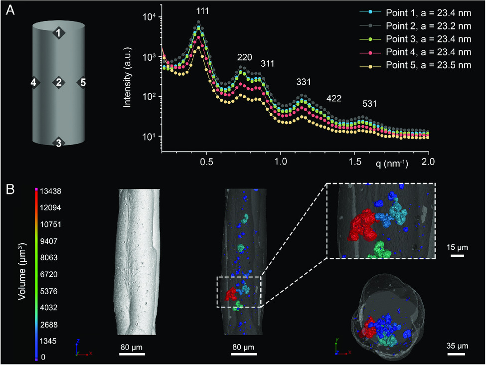 To evaluate possible changes in the superlattice, synchrotron-based small-angle X-ray scattering (SAXS) analysis was performed at different points along the cylinder axis. The scan determined that a superlattice was formed, and no significant differences in the lattice parameters as a function of column position were detected.Apply abstract X-ray microscope (XRM) to3D printingA part of the column with a total length of 460 μm. The scan detected asymmetrically distributed internal voids and pores inside the 41 311 μm3 chromatographic column, which is equivalent to 0.6% of the total estimated volume of the sample.