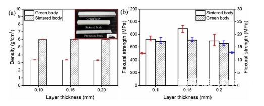 Figure 3 shows the density and bending strength of the green body and sintered body when different layer thicknesses are tested. The layer thickness has no significant effect on the density of the printed and sintered bodies (see Figure 3(a)). The density of the billet is 0.35 g/cm3, which is 58% of the theoretical density of 3Y-TZP, and the density of the sintered billet is about 6.0 g/cm3, which is 99% of the TD. As shown in Figure 3(b), the flexural strength of the blanks prepared with different layer thicknesses reached more than half of the 30mpa flexural strength of the injection-molded blanks, which proved that the interlayer bonding inside the blanks was sufficient. The strength of the sintered body with a thickness of 0.15 mm exceeds the strength of the sintered body with a thickness of 0.1 mm and 0.2 mm, reaching 890 MPa, which is close to the level that can be achieved by dry pressing or injection molding. Further optimization of printing parameters to minimize processing defects and improve the reliability of prepared materials will be carried out in follow-up research.