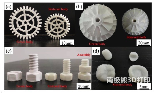 Figure 4 shows some zirconia ceramic parts prepared by the research and development FDM method. The longitudinal linear shrinkage rate of the rectangular bar from the blank to the sintered part is 20.5%. By comparing the geometry of the blank, it is confirmed that the method has a reliable shape-retaining ability (see Figure b)).