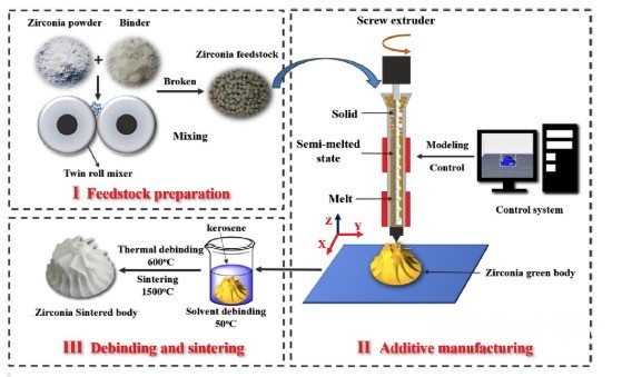The equipment usually uses flexible filaments with a fixed diameter, but the mixture of polymer binder and ceramic powder exhibits brittleness at low solid content (30% wt%), making it difficult to prepare flexible ceramic filaments. However, for high-performance raw materials, the solid content sometimes needs to exceed 80wt% or even higher. In ceramic injection molding, this high solid content raw material is usually crushed into pellets, conveyed by screw extrusion, and heated and extruded to finally obtain dense and uniform filaments at the nozzle. For ceramic injection molding, the selection of organic binders, the preparation of raw materials, the methods and equipment for debinding and sintering have been deeply researched and successfully developed for decades. This knowledge can be used to optimize the process parameters of the screw-based printing equipment, which is equipped with a screw extrusion device and is suitable for the additive manufacturing of engineering ceramic parts using Al2O3, ZrO2, Si3N4 or SiC powder from micrometer to nanometer scale.