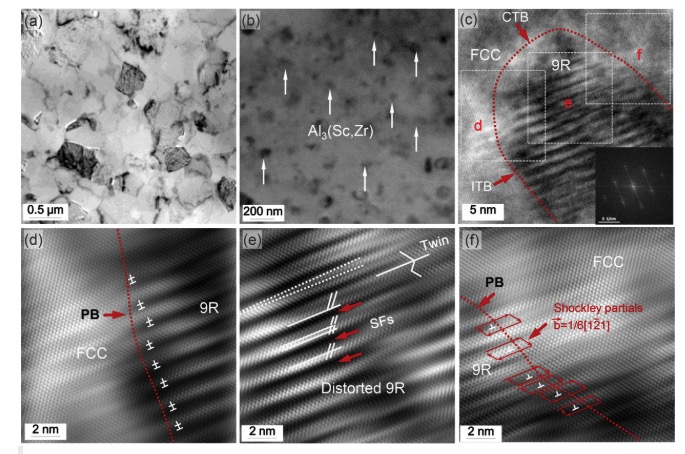 Among aluminum alloys, solid solution strengthening, grain boundary strengthening, work hardening and precipitation/dispersion hardening are well-proven strengthening mechanisms. The #5 alloy sample formed high-density stacking faults and a unique 9R phase, and its tensile strength and elongation reached 497mpa and 11%, respectively. After calculating the strengthening effects of each strengthening mechanism, the author believes that the high-density stacking defects (SFs) and 9R long-period ordered stacking (LPSO) phase strengthening mechanisms provide additional strengthening. After aging treatment, the tensile strength reaches 550mpa, and the plasticity is between 8% and 17%.