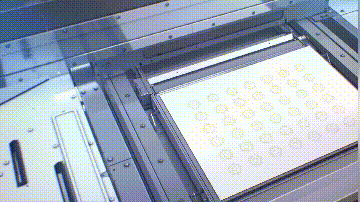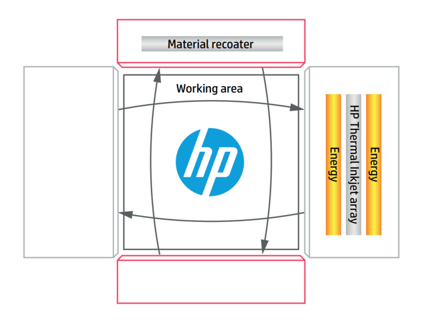 The printing process involves spreading a thin layer of powdered material over the entire work area. For example, in Figure 1, the material applicator carriage is scanned from top to bottom. Next, the print and fuser carriage with the HP hot-end (printhead) array and material scans the entire work area from right to left. The work area can be preheated immediately before printing to provide consistent and accurate temperature control as each layer is printed. The print head can print functional agents onto the material at precise locations to define the geometry of the part and its properties. The carriage returns from left to right to blend the area just printed.