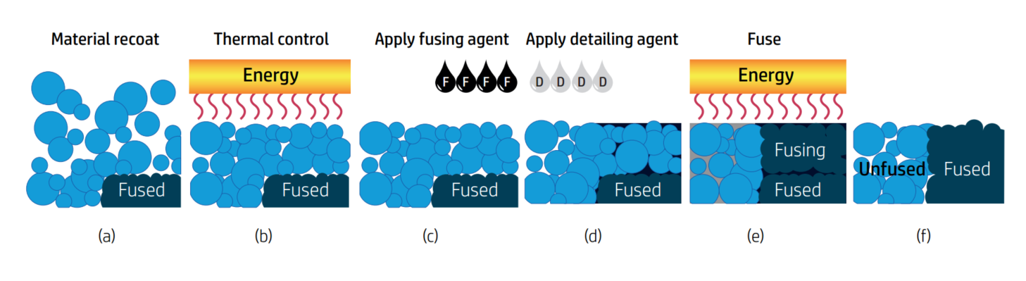 Because HP Multi Jet Fusion technology produces parts with Z-axis tensile strength comparable to that in the X and Y planes, it overcomes certain other3D printingLimitations of Z-axis strength reduction in technology. Figure 2f shows the fused and unfused regions at the edge of the part. The work area will then retract in preparation for the next recoating, printing and fusing cycle. Figure 2 is an overview of the processing steps in HP Multi Jet Fusion technology. in specific HPJet Fusion