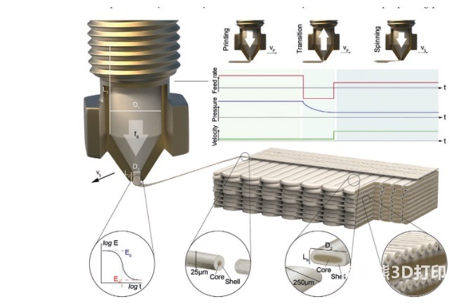 However, composite materials are difficult to recycle and are not conducive to sustainable development. In contrast, light-weight materials in nature, such as bone, silk, and wood, form complex hierarchical structures through directed self-assembly, thereby exhibiting excellent mechanical properties and capable of recycling in nature. In 2018, a research team from the Swiss Federal Institute of Technology in Zurich published a study on thermotropic liquid crystal polymers in the journal Nature.3D printingrelated research, through3D printingThermotropic liquid crystal polymers obtain high-strength, lightweight recyclable parts that self-assemble into core-shell structures[1]. In 2021, on this basis, the team proposed spinning3D printing technologyPrinting liquid crystal polymers[2]. In order to realize the spinning process based on melt extrusion, the research team controlled the feed rate of the polymer, accumulated the molten polymer at the nozzle, and finally pulled out the fibers at a high draw rate. Its printing principle is shown in Figure 1.