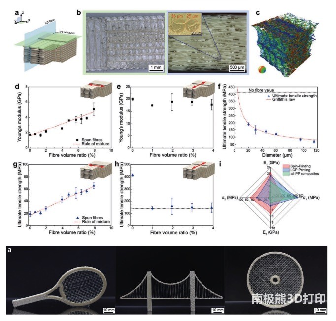 Since the fiber-reinforced laminate fibers formed by spin printing and the matrix material are both liquid crystal polymers, they are fully recyclable. The mechanical properties of the fibers produced by spinning 3D printing decreased with the increase of the fiber diameter. To evaluate the effect of spun-printed fibers on the mechanical properties of cross-laminates, the fiber-reinforced laminates were subjected to longitudinal (0°) and transverse (90°) tensile loads with a fiber content of 7.9 Vvol%. The elongation modulus is increased by 3.4 times and 3 times, respectively. The team also explored the change law of mechanical properties of laminates with different fiber content, and the tensile strength and modulus showed an increasing trend with the increase of fiber content. This spinning printing technique can print fiber-reinforced complex structures as shown in Figure 2, and this structure can be designed to change the fiber content in specific directions to meet the requirements under different mechanical loading conditions. Fiber-reinforced complex structures printed by spinning are fully recyclable and recyclable multiple times.
