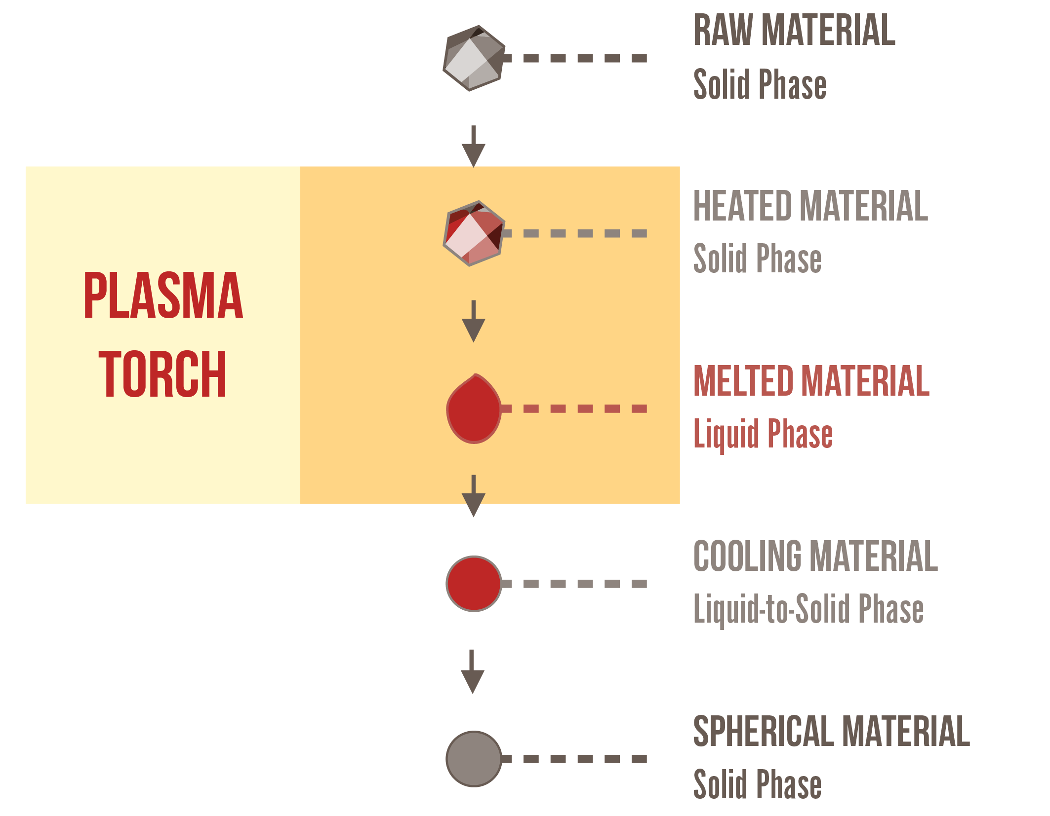 - Sphericalization (SphEroIdiZation): The pulverized, atomized and sponged powder is converted into highly dense spherical powder particles, including heating and melting of the feed particles, and then cooling under controlled conditions.