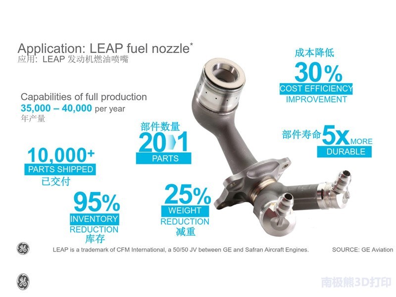 GE Aviation3D printingThe fuel nozzles are used in LEAP engines. According to different engine models, each engine needs to install 18 or 19 fuel nozzles. After the nozzles were certified for flight in 2016, the LEAP engine orders totaled more than 14,000 at the 2017 Paris Air Show, which means a minimum of 250,000 fuel nozzles are required.