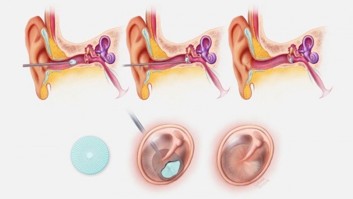 Currently, the best treatment is the so-called tympanoplasty, which involves the use of a transplant of the patient’s own tissue for repair. But the end result is not as sound as a healthy tympanic membrane. The operation requires an incision behind the ear, and it often fails and requires another operation.