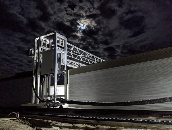ICON’s Vulcan system 3D prints the military camp of the Texas Military Department at night. Image courtesy of ICON.