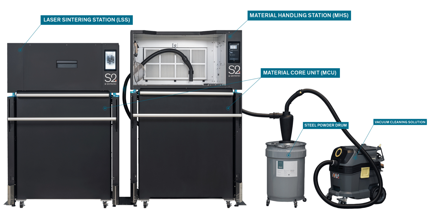 It is an all-in-one 3D printer, and the selective laser sintering system consists of a laser sintering station (LSS), a core unit (MCU) and a material handling station (MHS). Together, these modules form a unique, self-contained additive manufacturing process system.