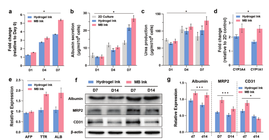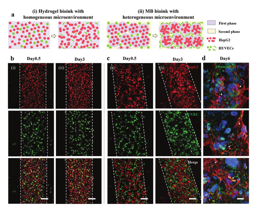 The researchers encapsulated HepG2 and HUVEC in microgel and hydrogel precursors of MB bioink, respectively, to print liver tissue. It was found that HUVEC mainly existed in the inter-microgel region of the MB bioink group.Compared with the pure hydrogel bioink, HUVECs in the MB bioink group exhibited a higher proliferation rate on days 3 and 7, and elongated morphology, forming random tubular shapes through endothelial cell assembly